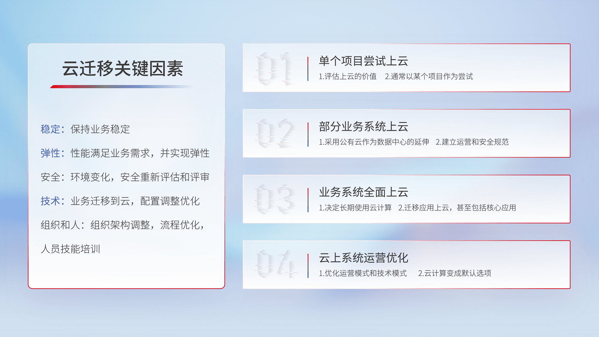 结合实际业务,,从规划设计、、、云平台选型、、、、云原生改造、、、、数据迁移、、、、集成交付,,迁移全过程为客户识别最佳上云路径,,,,做好风险识别管理,,,设计网络架构、、、身份权限、、、、安全审计合规、、操作审计、、、、日志审计、、、监控告警策略、、、、多站点容灾设计等,,,,对云上基础设施进行整体规划,,提升IT治理水平,,,,以满足弹性、、、、高可用、、、、高性能的需求。。。