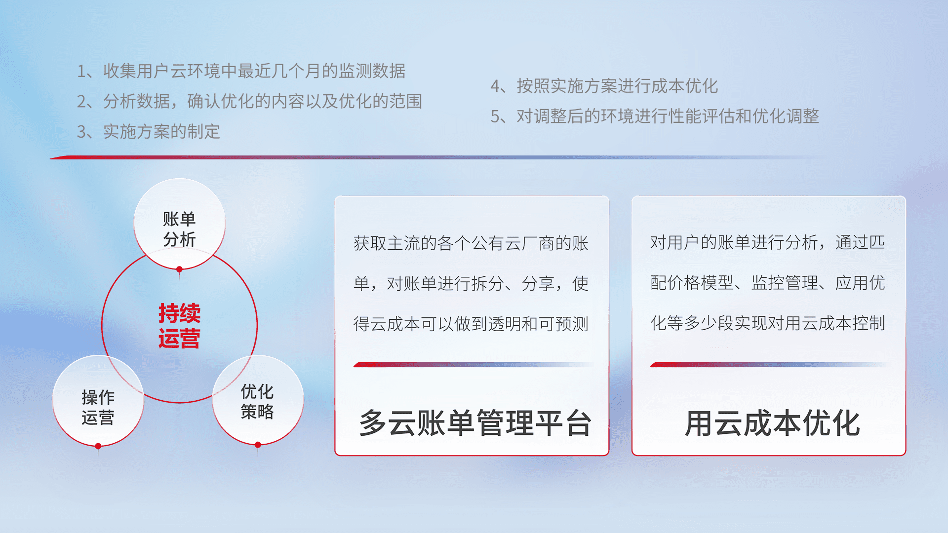 通过多云纳管,,以统一的资源数据模型把客户的云资源进行抽象和封装,,进而实现对多云资源的统一操作,,保障云资源管理的可靠性、、、稳定性与可用性。。。。量身定制化运维内容,,配置、、开发运维、、补丁管理、、、备份、、、监控、、、认证和访问管理、、、、审计和日常巡检等,,,保障在用云过程中的可靠度,,,稳定度以及高可用率。。。